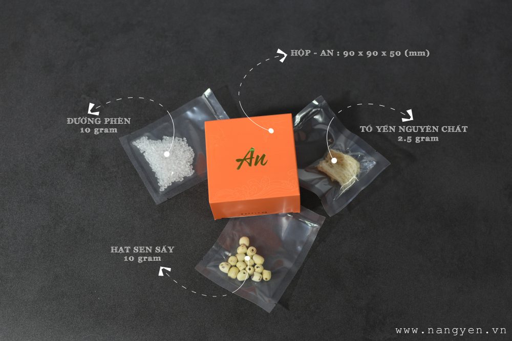 BỘ QUÀ TẶNG HY VỌNG – AN bao gồm 4 hộp nhỏ An - Khang - Thịnh - Phát và 1 thố sứ dùng để chưng yến. Mỗi hộp chứa tổ yến (dạng miếng vuông 2.5g) cùng nguyên liệu đi kèm rất tiện lợi cho mỗi lần chưng.