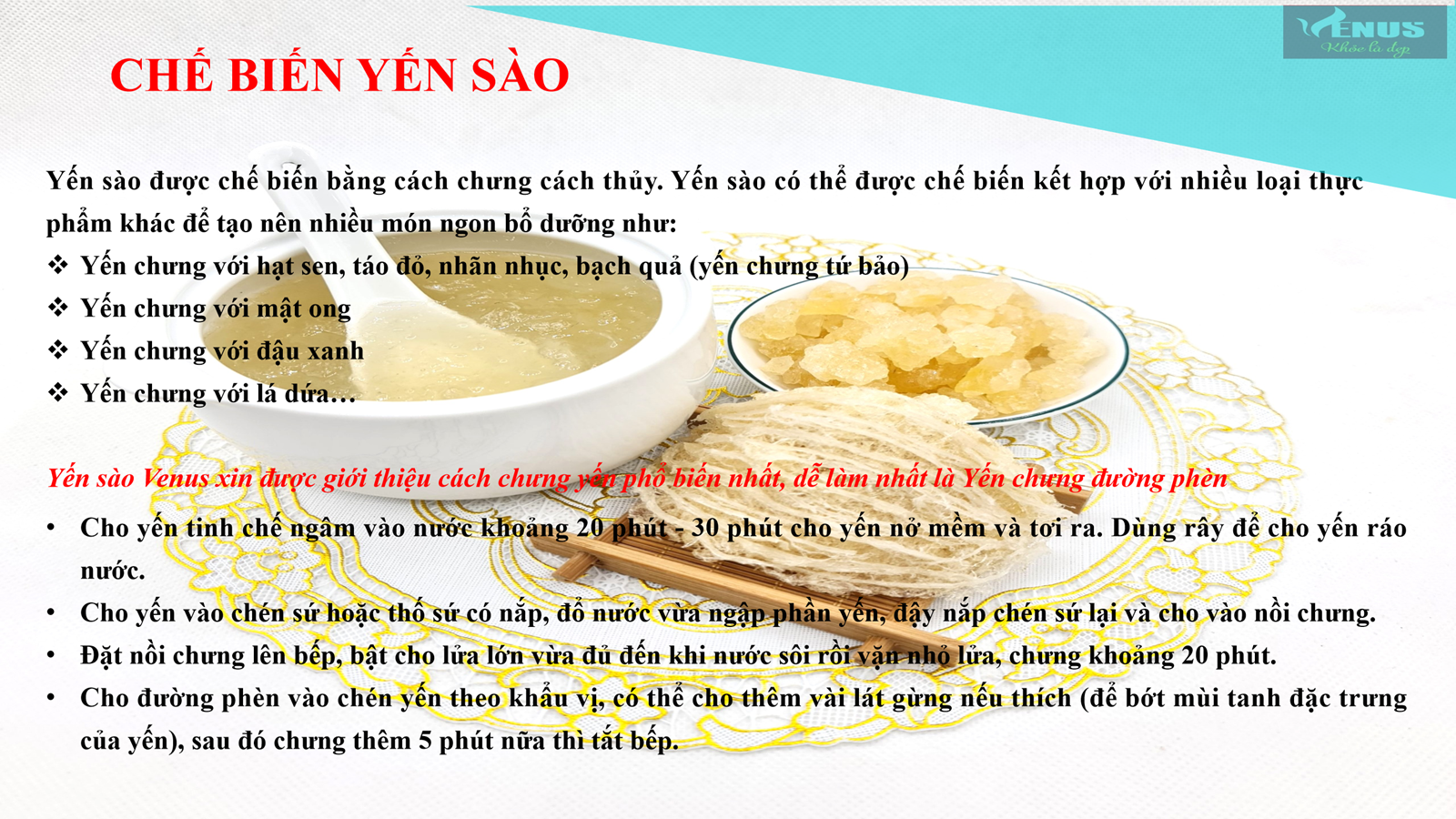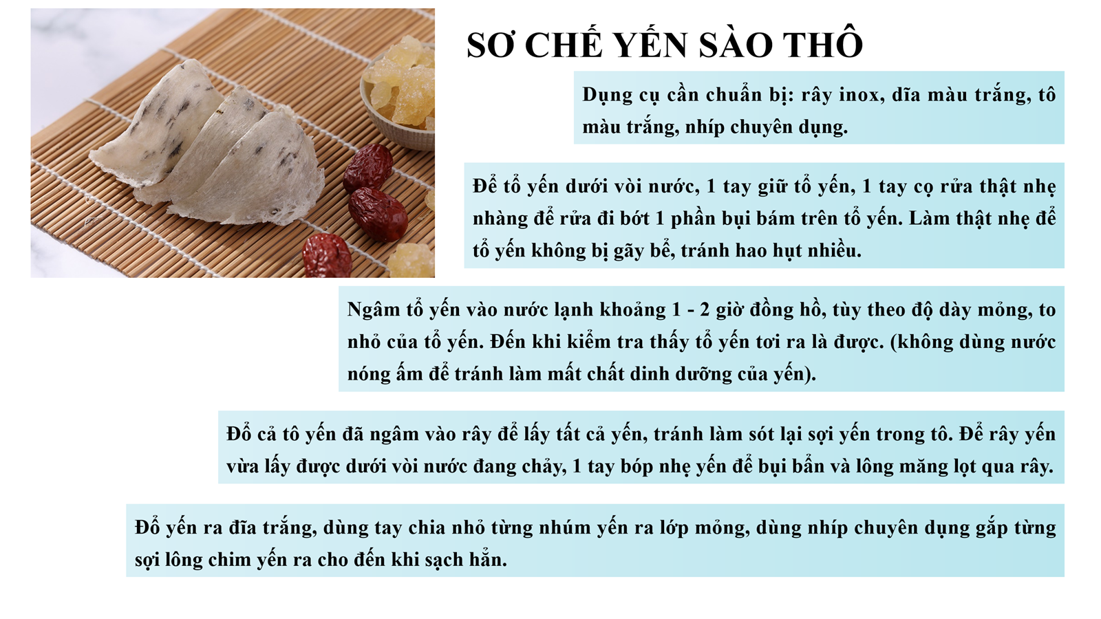 Hướng dẫn sử dụng | Sơ chế yến sào thô, sau đó đem chưng cách thủy. |