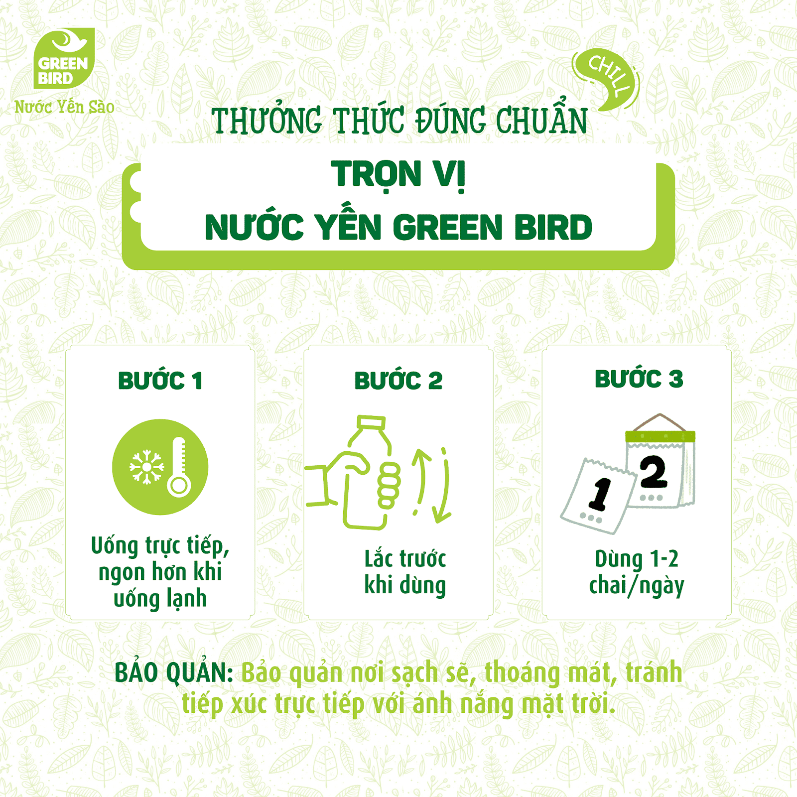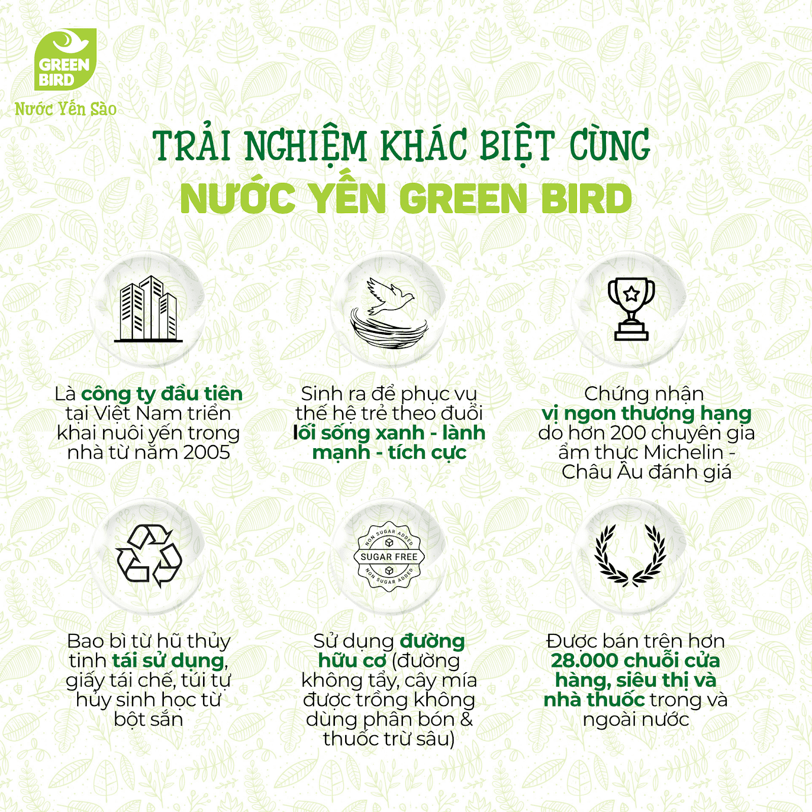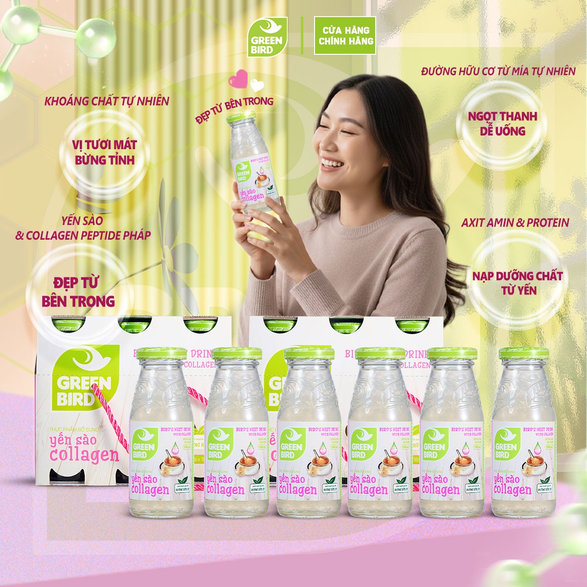 Green Bird - Nước Yến Sào và Collagen là sự kết hợp tinh tế giữa yến sào & Collagen Peptide từ Pháp, mang đến giải pháp làm đẹp từ bên trong. Với công thức đặc biệt và hương vị thanh mát từ đường hữu cơ, sản phẩm không chỉ bổ sung dưỡng chất mà còn giúp thư giãn, tái tạo năng lượng sau những giờ làm việc căng thẳng. Đây là khoảng lặng để bạn yêu chiều bản thân mỗi ngày.