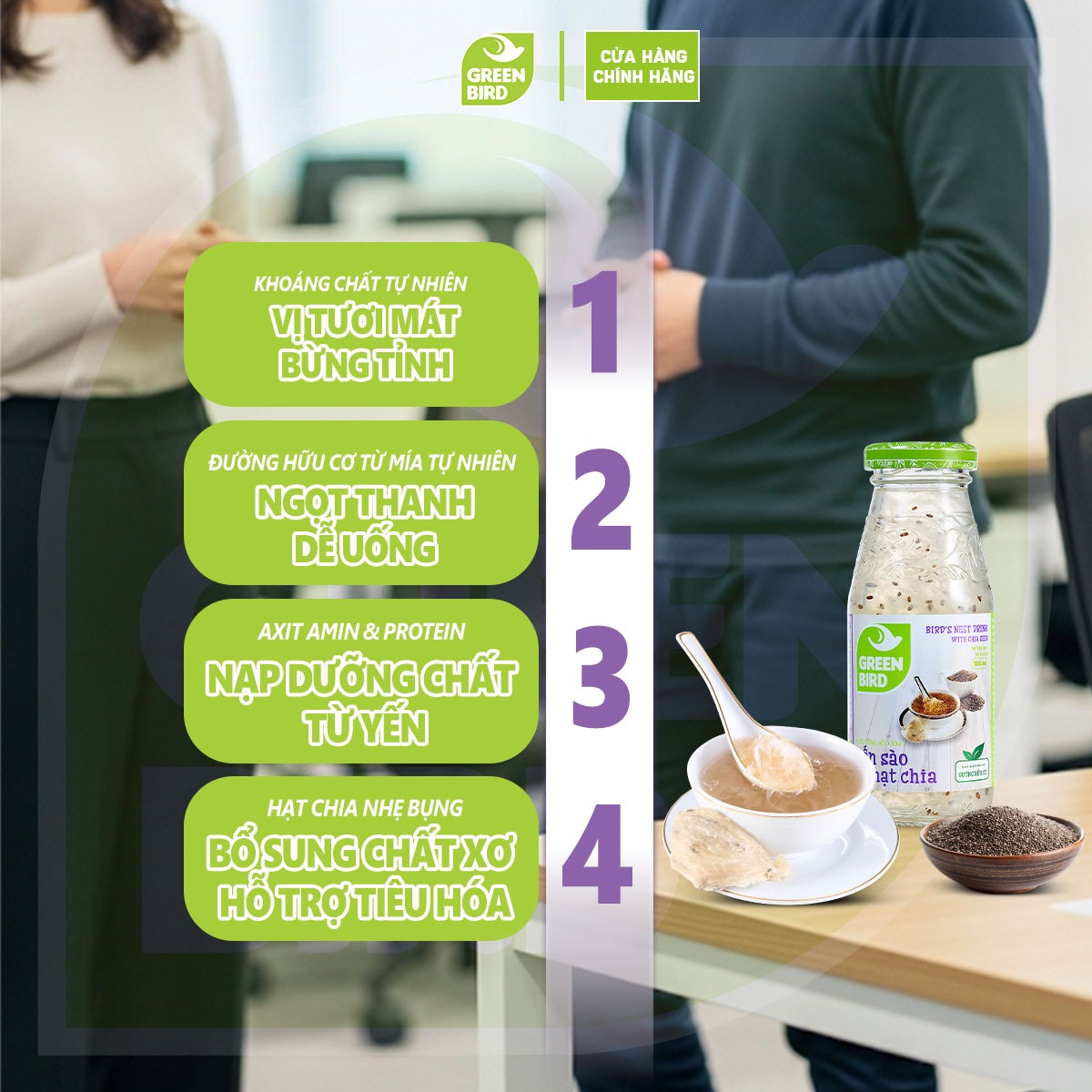 Green Bird - Nước Yến Sào và Hạt Chia là sự kết hợp nhẹ nhàng giữa yến sào và hạt chia giàu dưỡng chất. Với hương vị thanh mát từ đường hữu cơ, sản phẩm giúp bổ sung năng lượng, hỗ trợ tiêu hóa và mang đến cảm giác dễ chịu, thư giãn cho những lúc cần tái tạo sức sống.