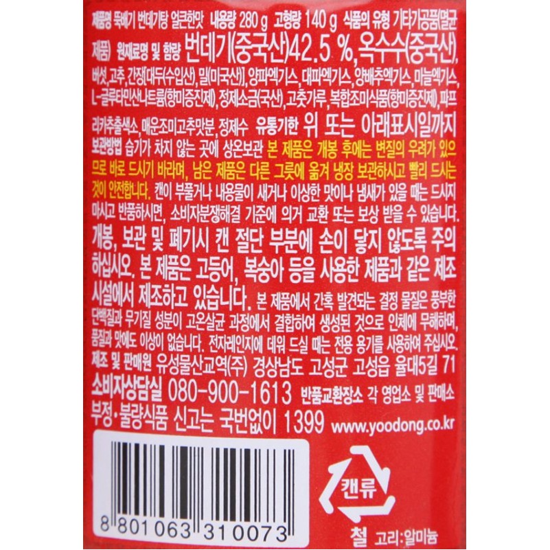 [YOODONG] CANH NHỘNG NẤU CAY ĐÓNG HỘP 280G - [유동] 뚝배기 번데기탕 얼큰한 맛 280G -Xuất Xứ: Hàn Quốc -Nơi sản xuất: Hàn Quốc -Thương hiệu: Yoodong Hàn Quốc -Hạn sử dụng: 24 tháng - Hướng dẫn bảo quản: nơi khô ráo, tránh ánh nắng mặt trời. -Thành phần:Nhộng ong, muối, đường, tiêu, tương ớt, rong biển Hướng dẫn sử dụng: Ăn trực tiếp hoặc chế biến thành những món ăn bổ dưỡng khác nhau